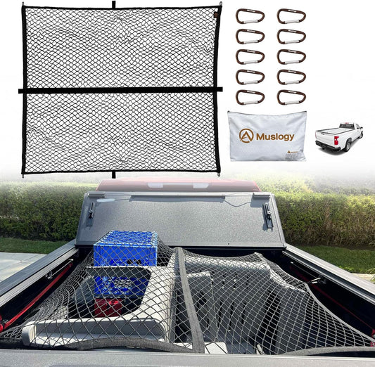 Muslogy Truck Bed Cargo Net Compatible with Pickup Truck Bed Organizer Stretchable 4'x4' to 7'x7' High Elastic Heavy Duty Upgraded Reinforced Storage Net with 10 Metal Carabiners (Single Layer)